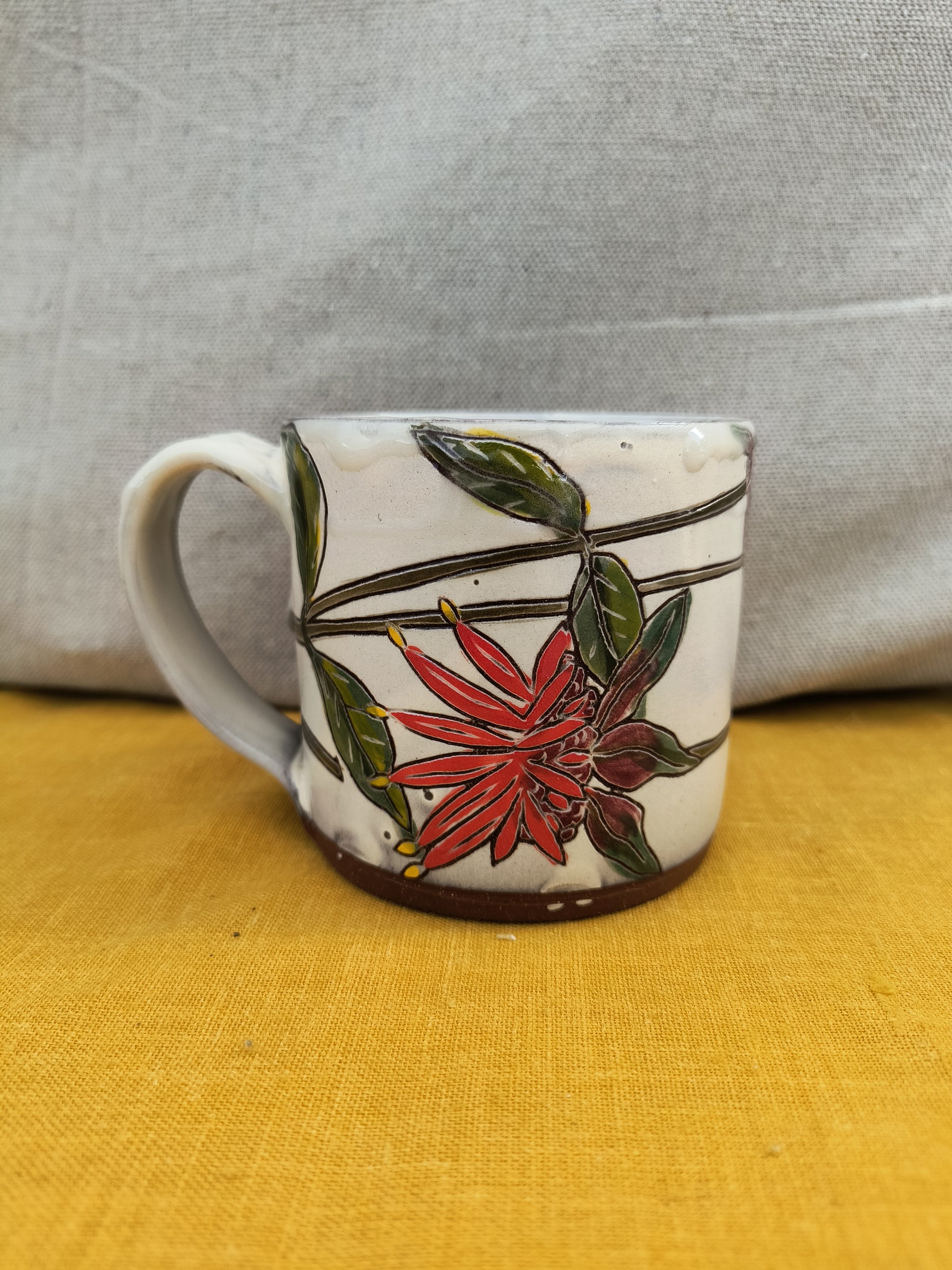 This mug is a cosmetic second. The glaze on the outside crawled leaving smooth drips. The glaze on the inside is smooth and normal, food safe. White interior glaze.