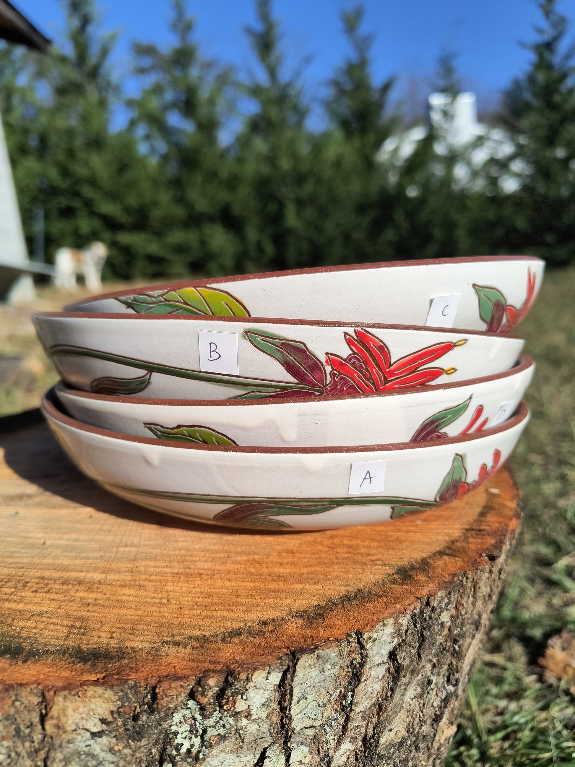 Low, wide bowls perfect for pasta or salad or pie and icecream. Each bowl is different, but all have Bee Balm flowers wrapped around the outside.