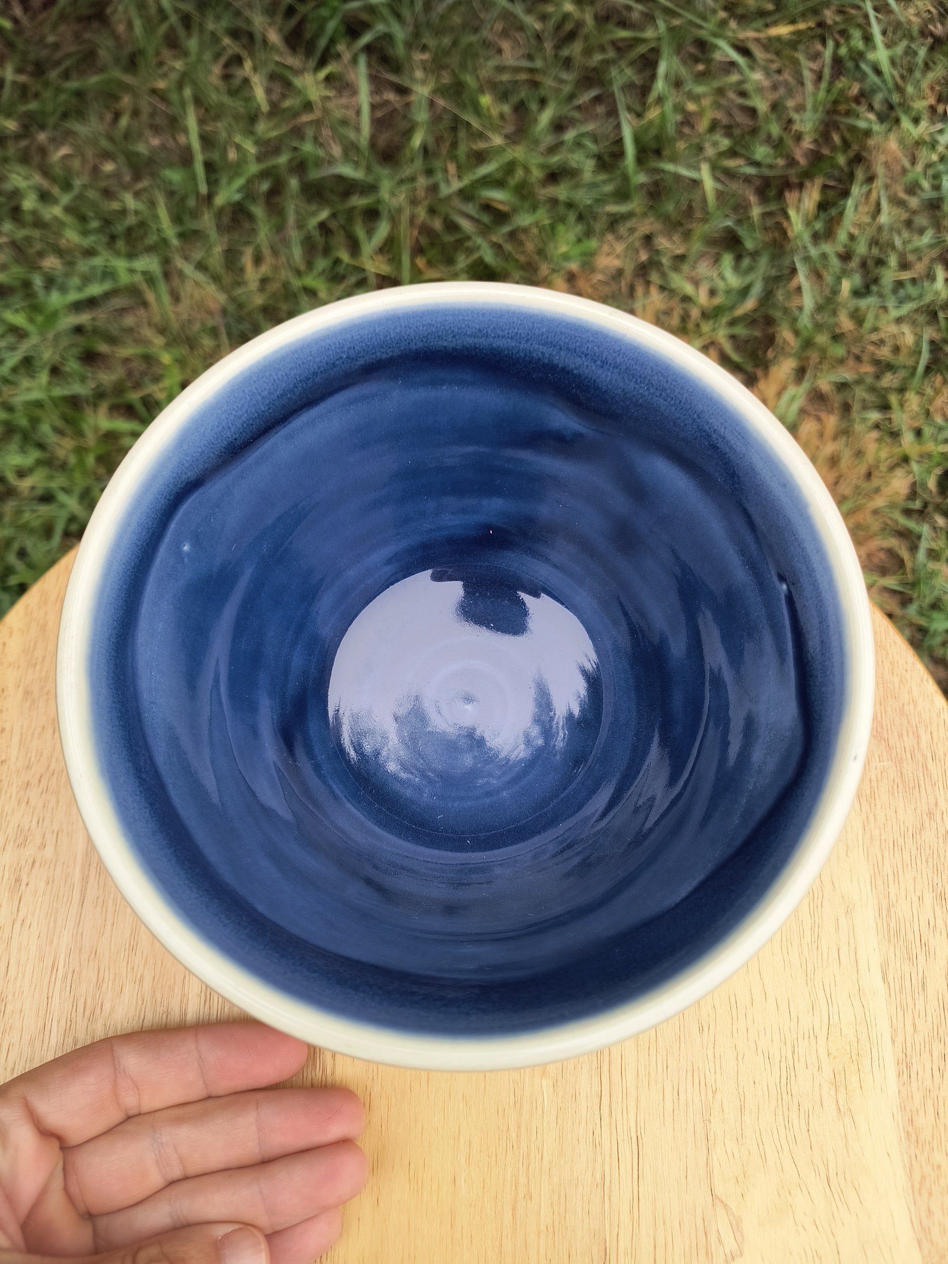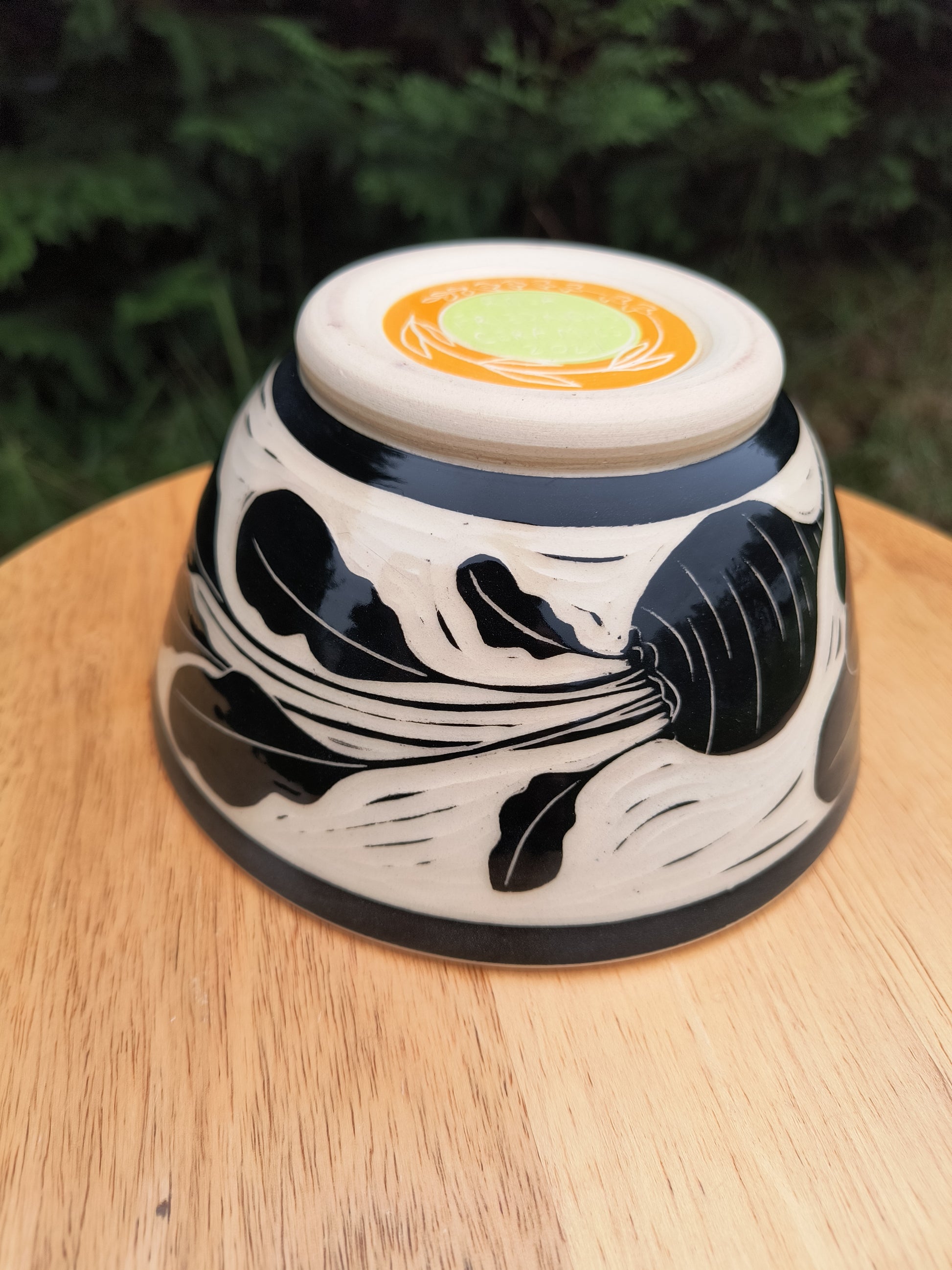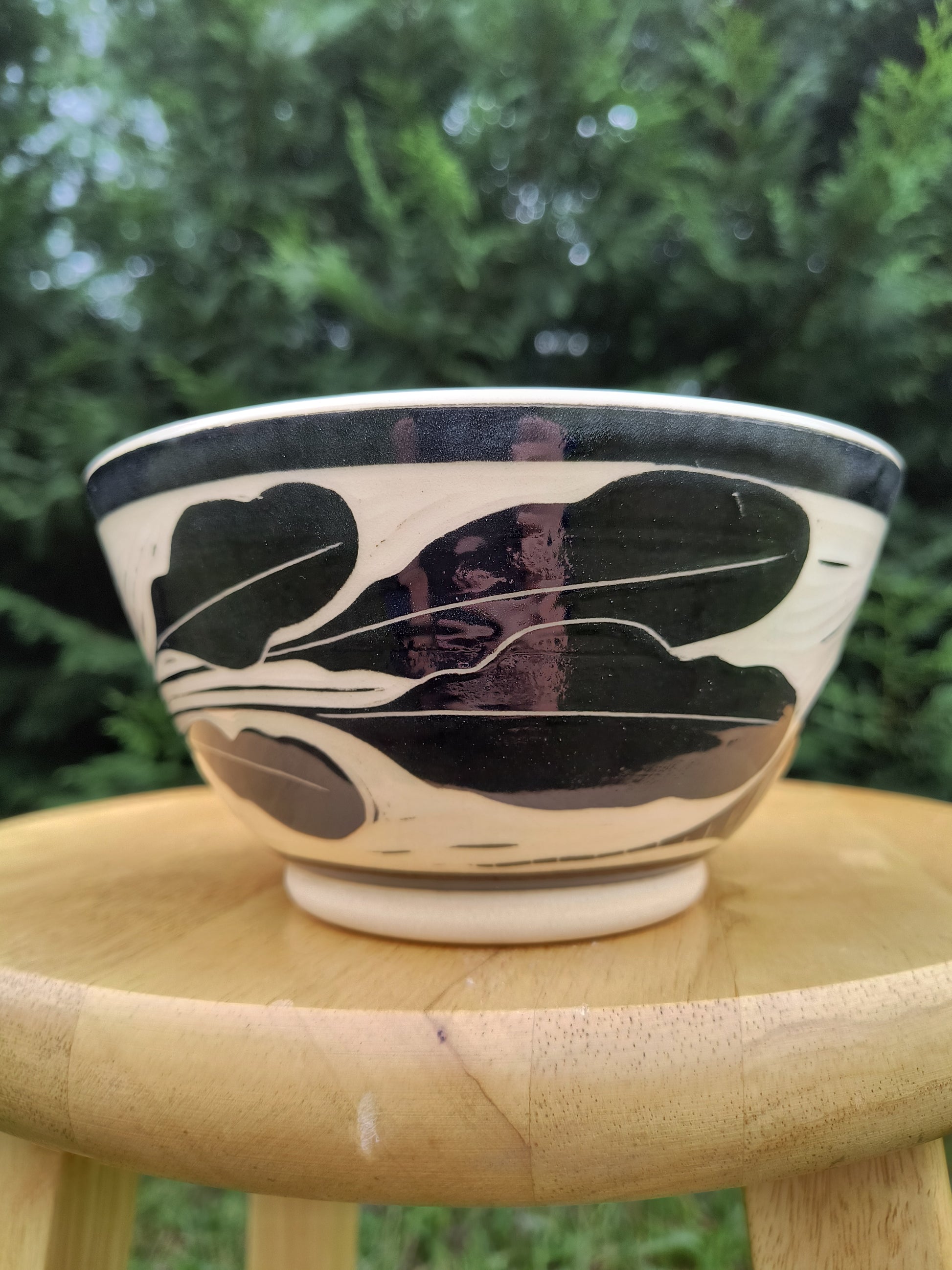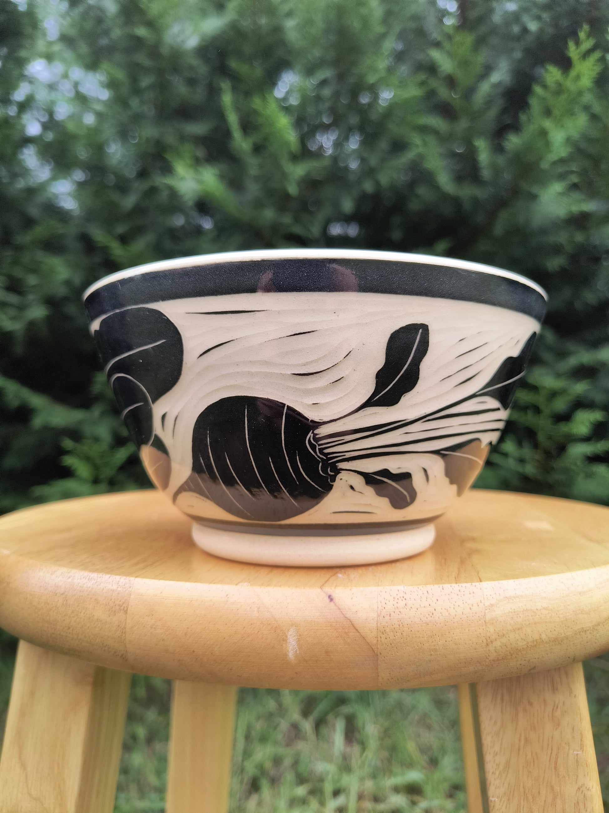 Black and White Sgraffito Beet Bowl with blue interior glaze.