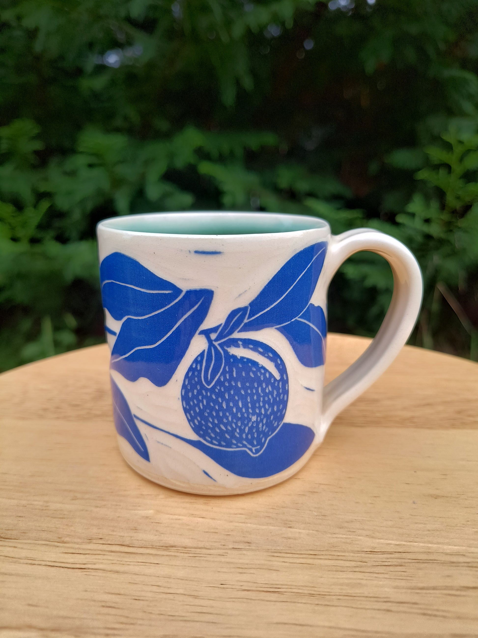 White clay mug with blue underglaze and sgraffito lemon tree branches. Green interior glaze.