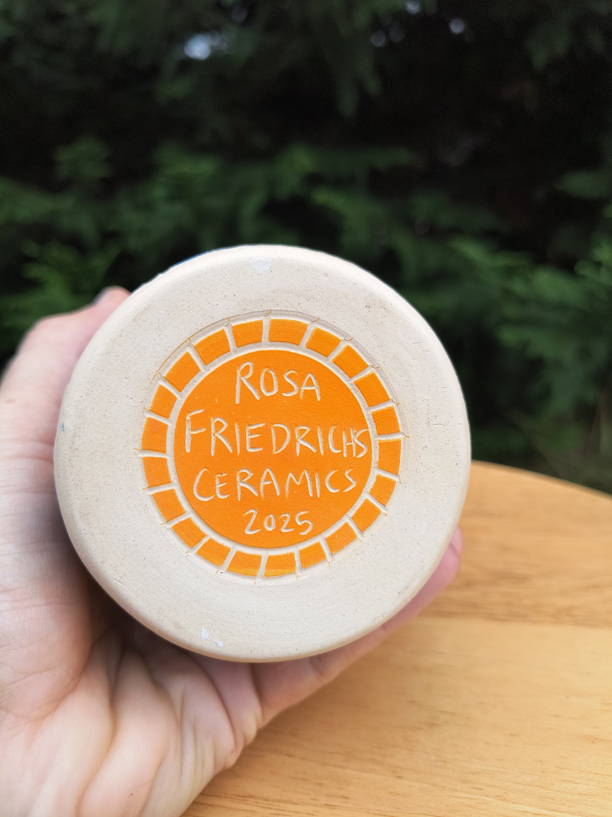 Olive oil bottle with blue and white sgraffito design of lemon tree branches with fruit and flowers.