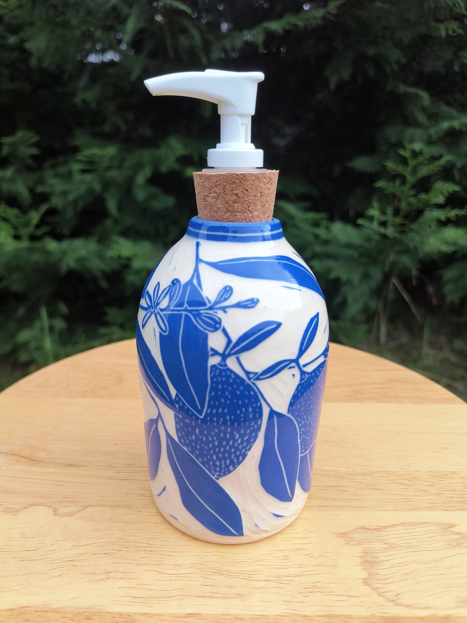White clay soap bottle with blue underglaze sgraffito lemon branches, cork stopper dispenser.