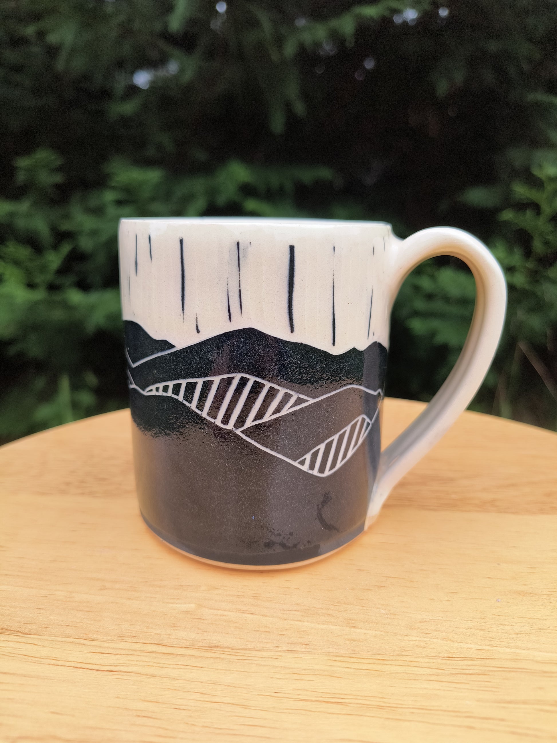 White clay Mug with black underglaze and sgraffito mountains. Green interior glaze.