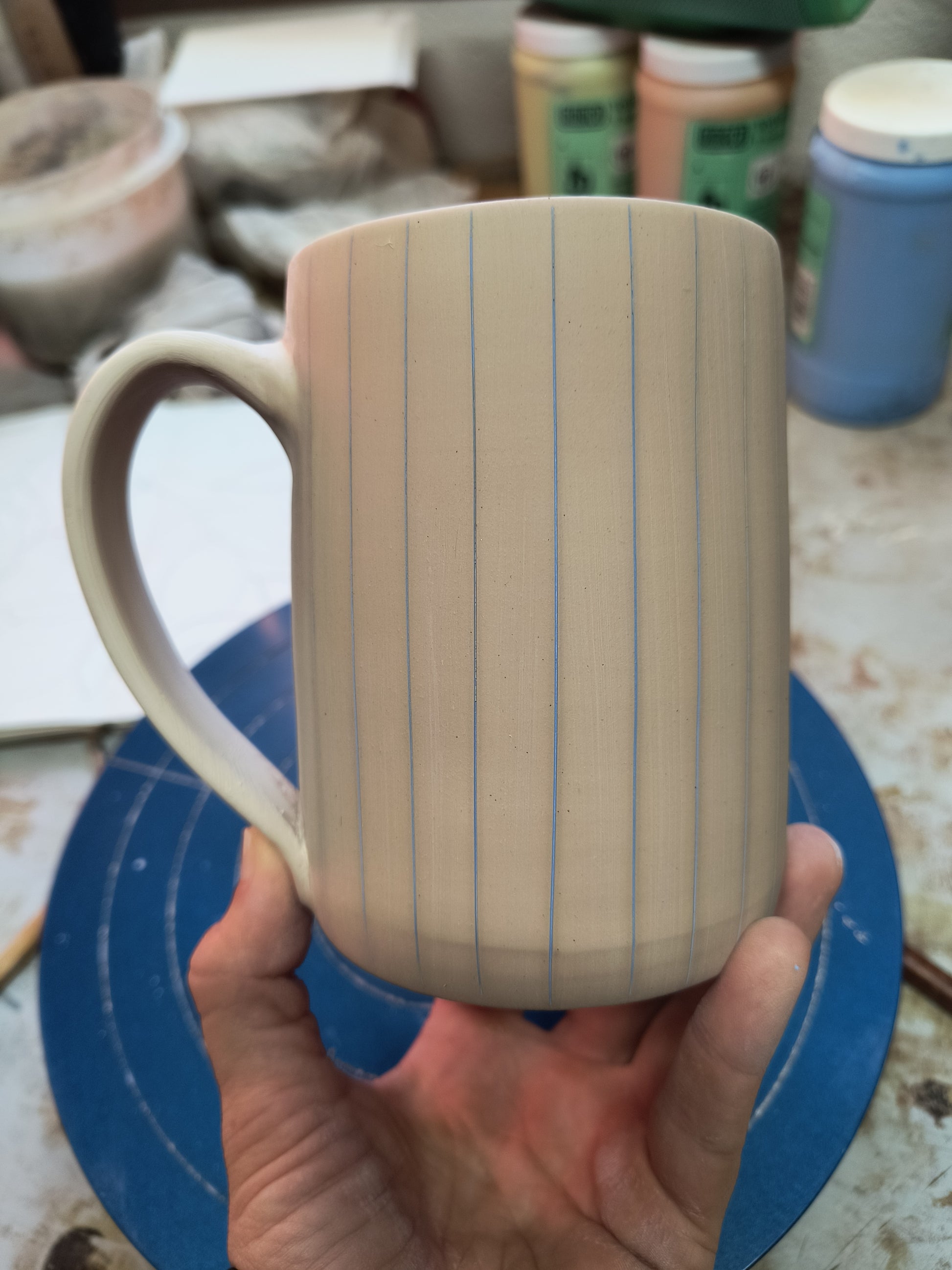 Pre-order for a 14 oz blue stripe mug! My favorite mug styles sold out before I could do my online sale so I'm making more and they will be ready to ship by December 15 at the latest. It will be white with thin blue lines, blue interior, clear exterior glaze. The finished mug will look like the last two pictures.