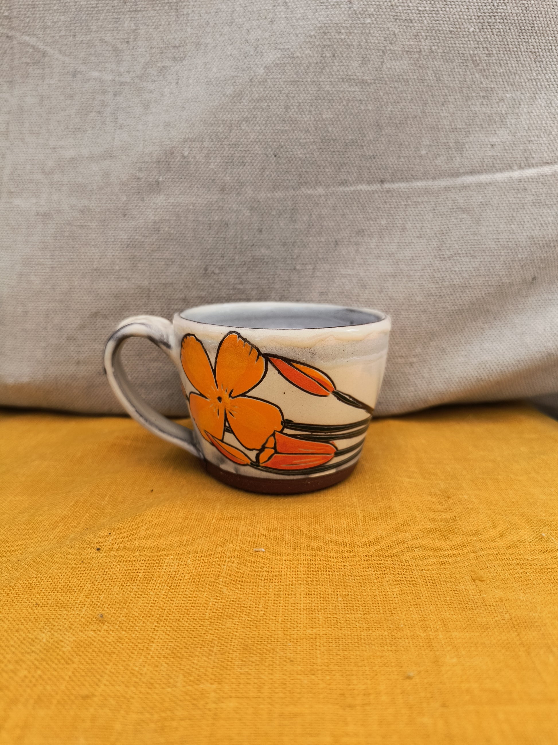 This mug is a cosmetic second. The glaze on the outside crawled leaving smooth drips. The glaze on the inside is smooth and normal, food safe. White interior glaze.