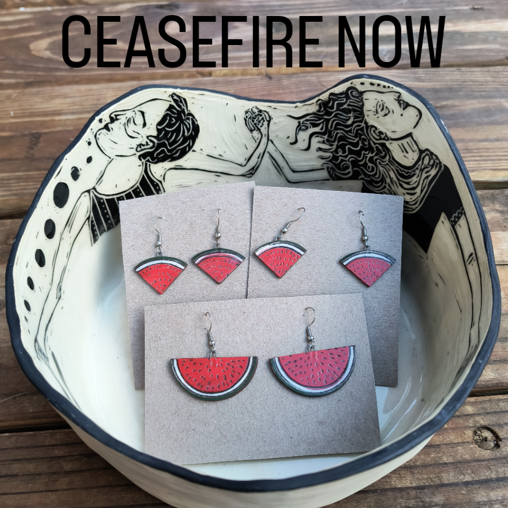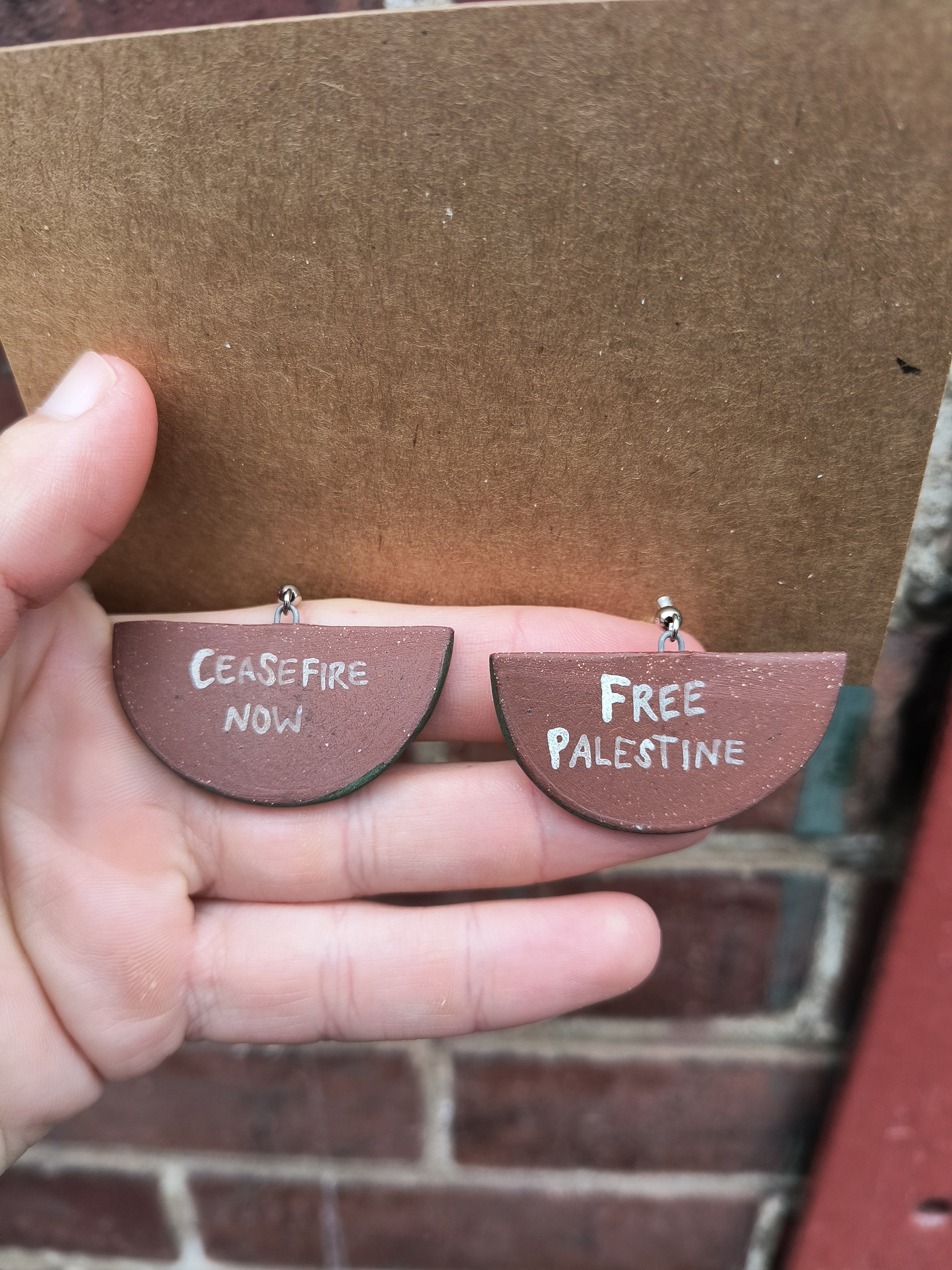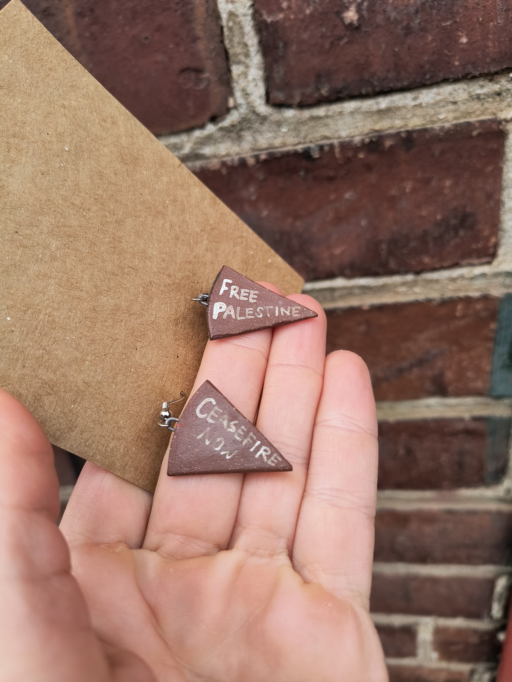 The earrings are made of red clay and decorated with white slip and colored underglaze. They have hypoallergenic stainless steel earring hooks. "Ceasefire Now" and "Free Palestine" are painted on the back of the earrings in white.Â