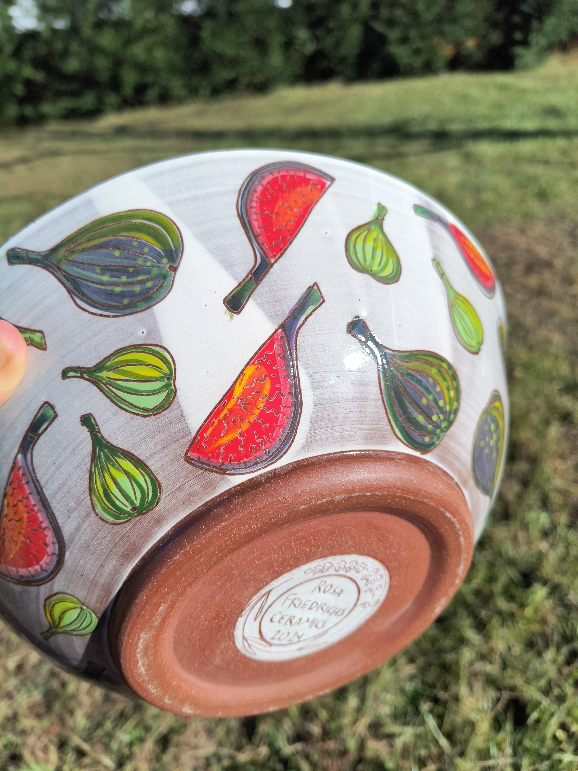 Red clay, white slip, colored underglaze, sgraffito, white interior glaze, clear exterior glaze, cone 5 electric.