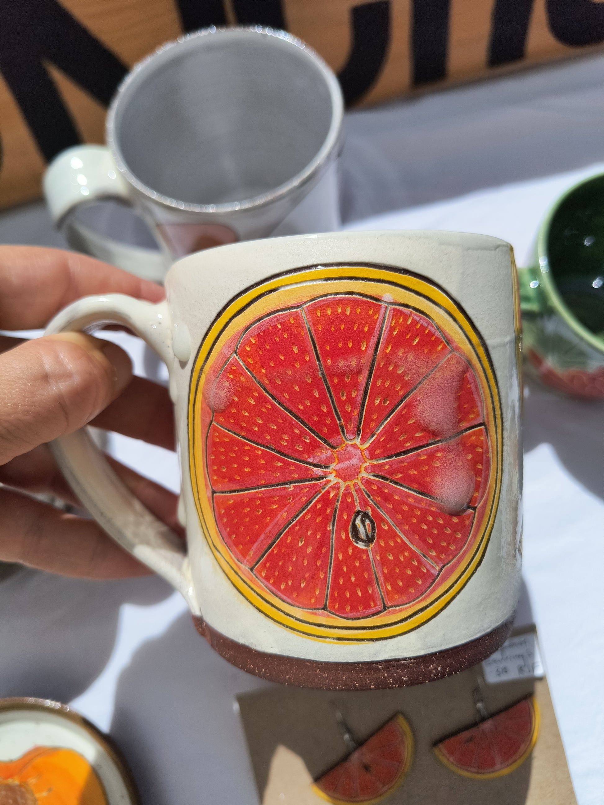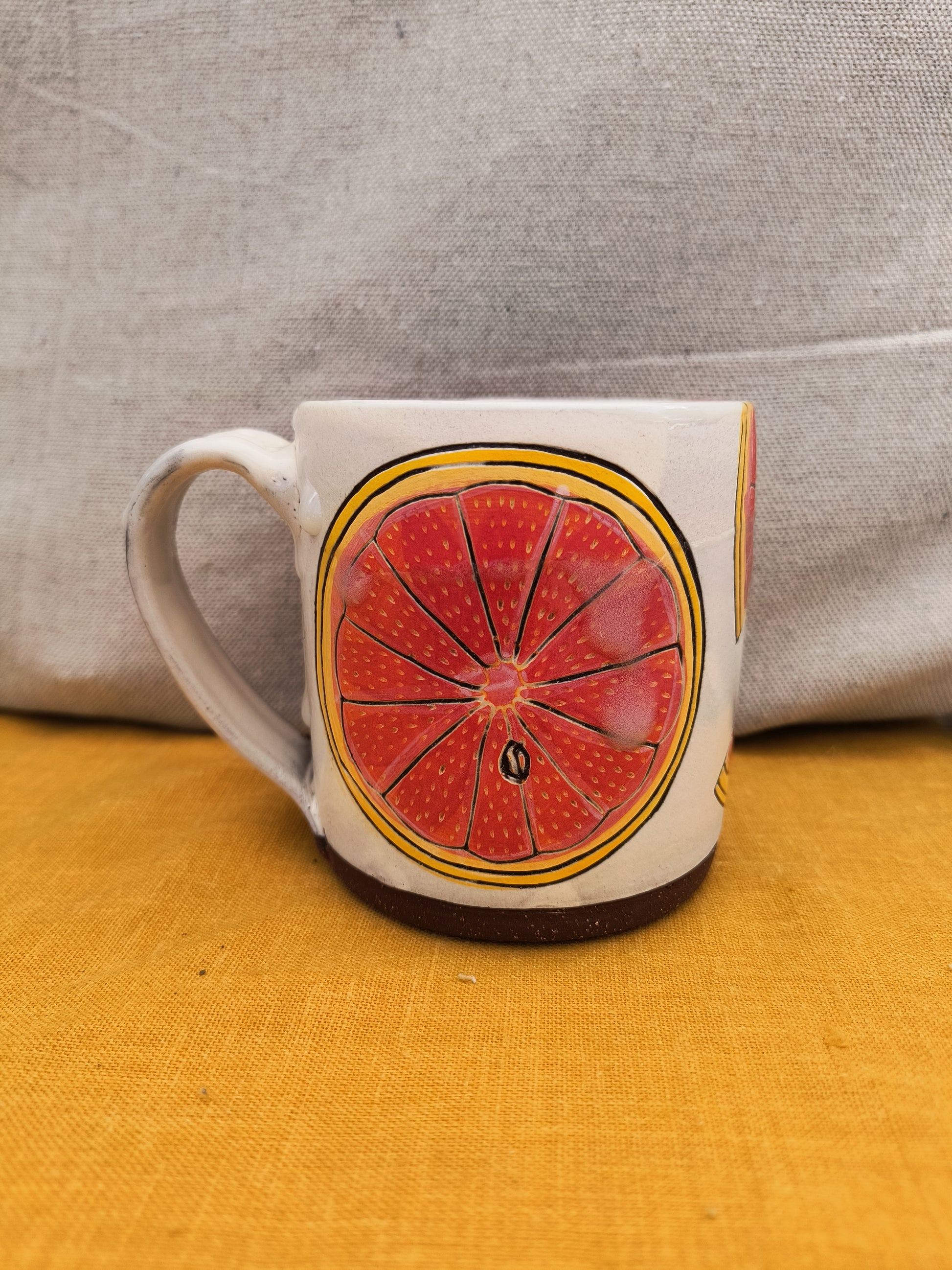 This mug is a cosmetic second. The glaze on the outside crawled leaving smooth drips. The glaze on the inside is smooth and normal, food safe. White interior glaze.