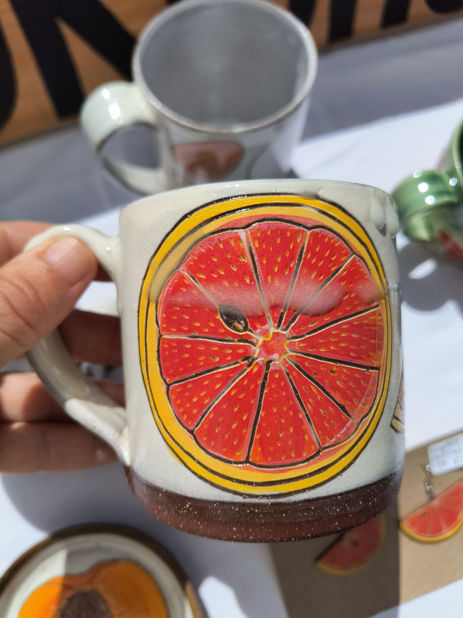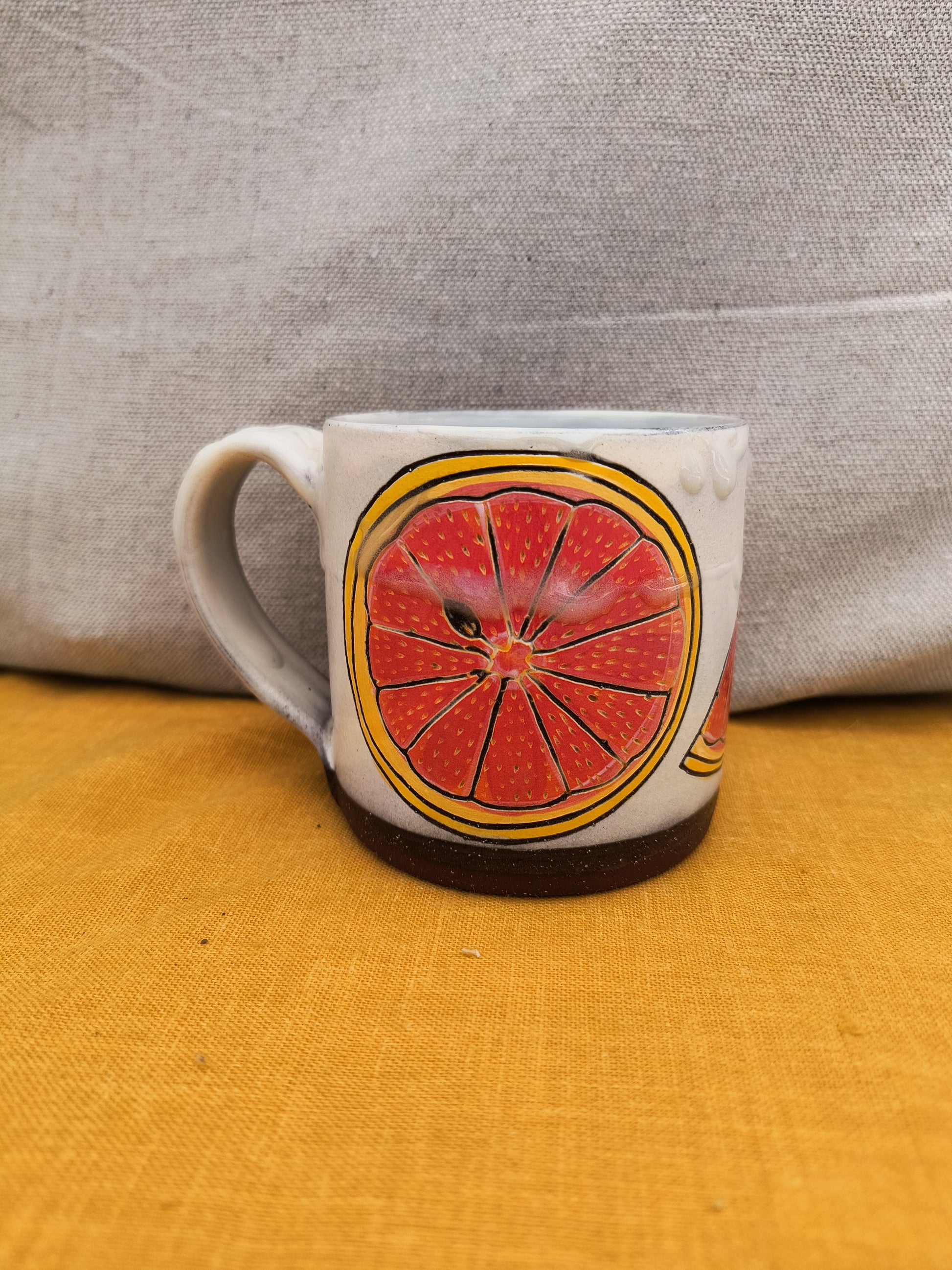 This mug is a cosmetic second. The glaze on the outside crawled leaving smooth drips. The glaze on the inside is smooth and normal, food safe. White interior glaze.
