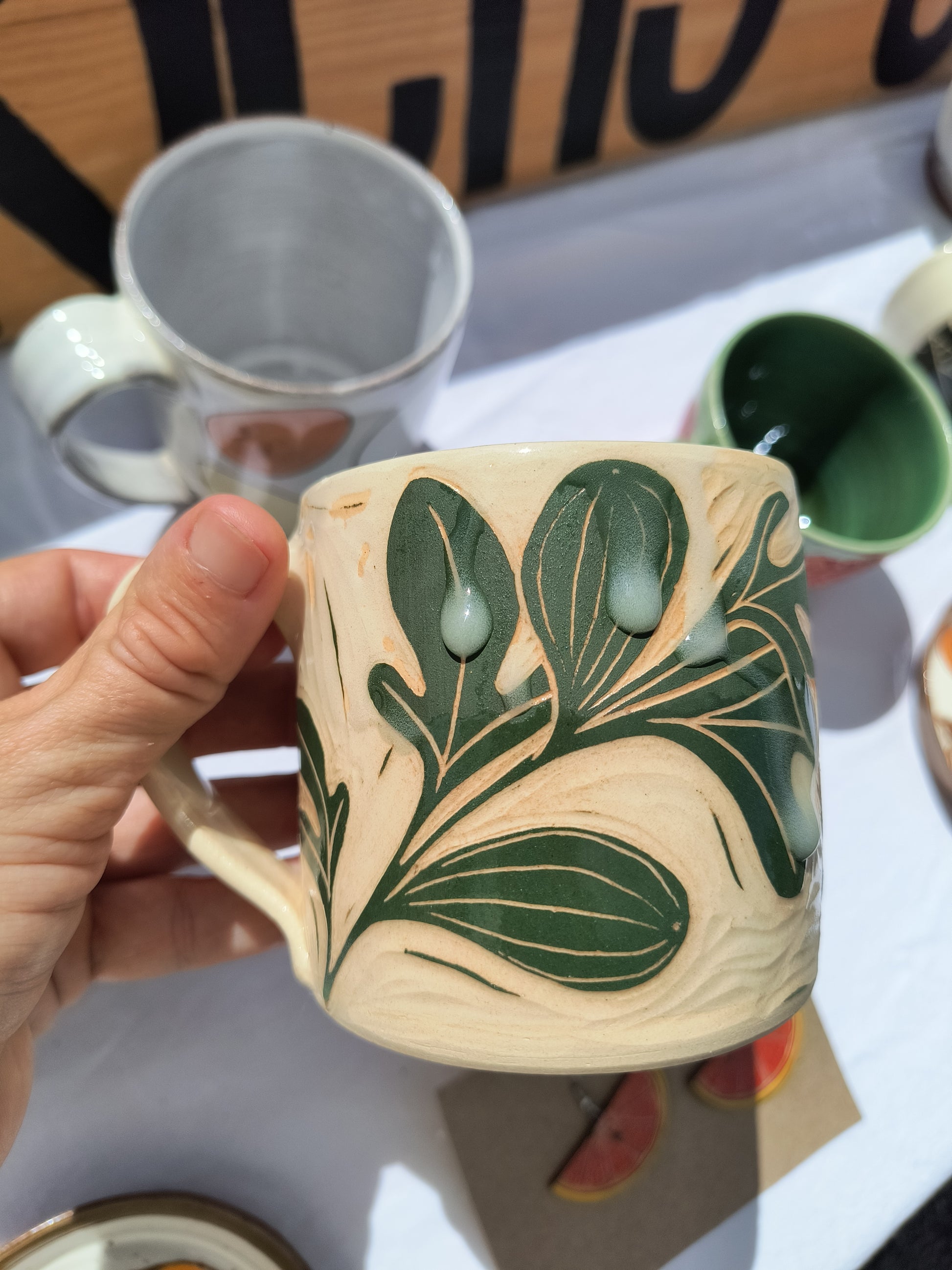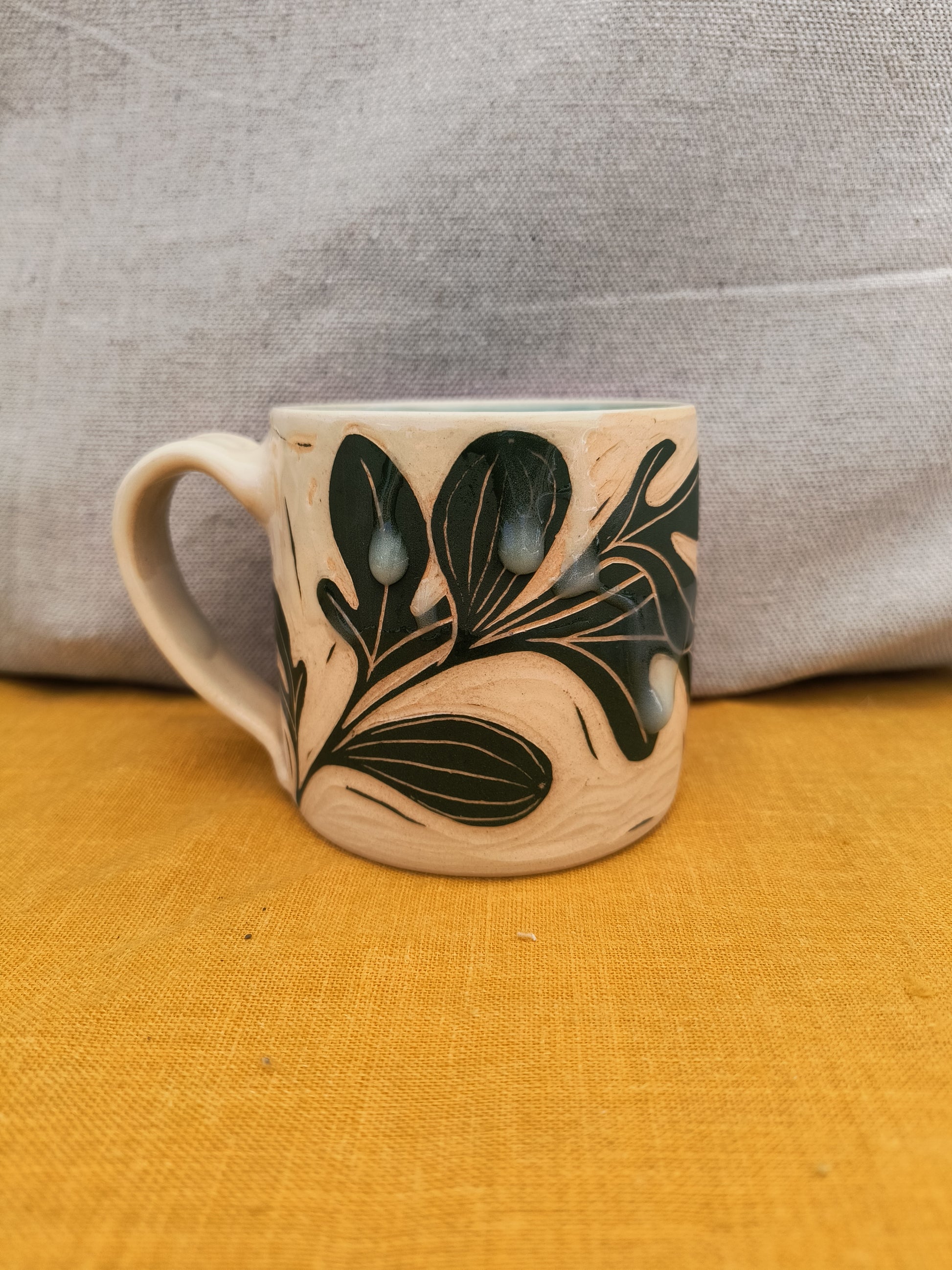 This mug is a cosmetic second. The glaze on the outside crawled leaving smooth drips. The glaze on the inside is smooth and normal, food safe. Green interior glaze.