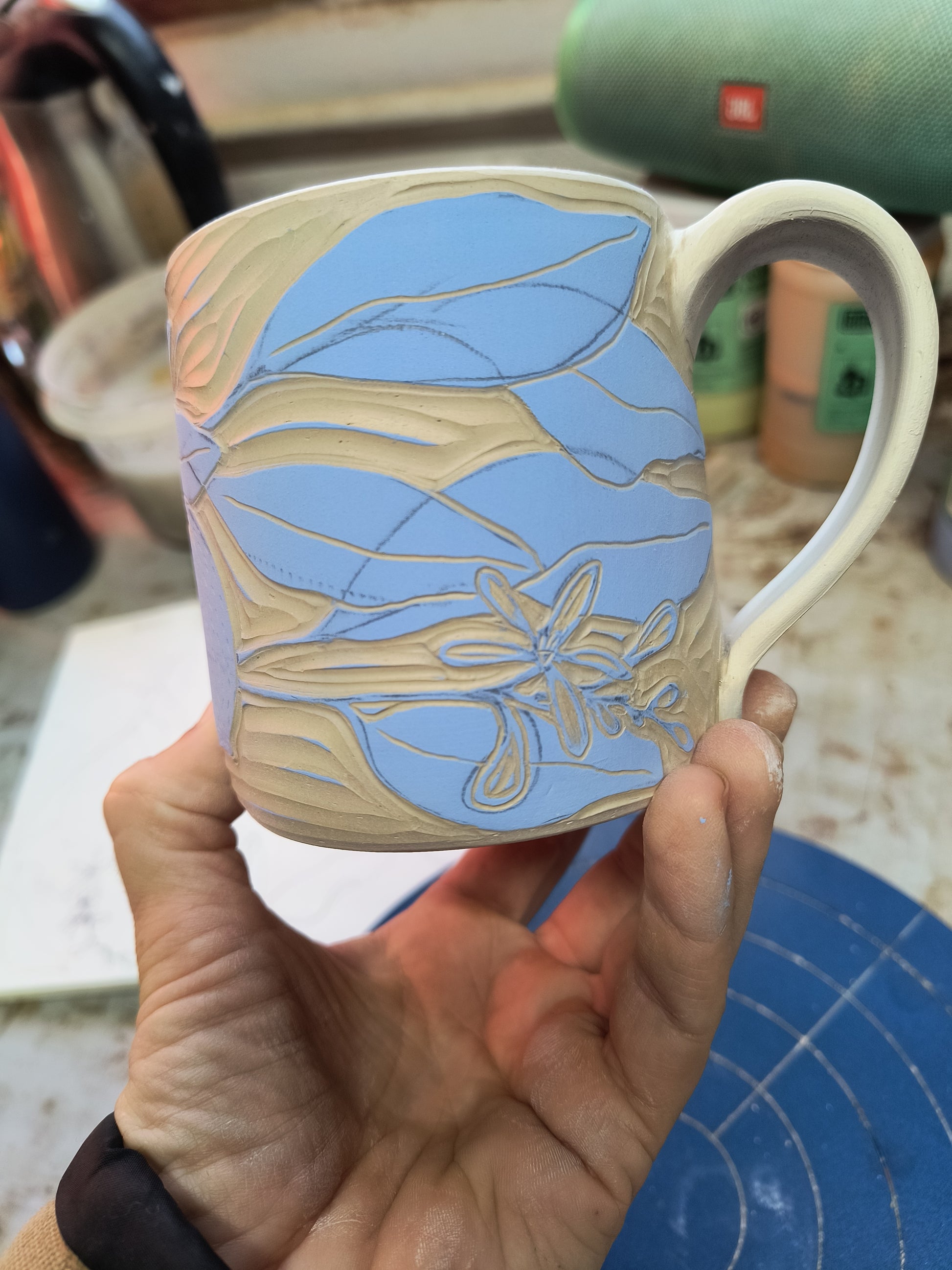 Pre-order for a 10 oz lemon mug! My favorite mug styles sold out before I could do my online sale so I'm making more and they will be ready to ship by December 15 at the latest. The first picture is your mug. Once it's fired it will turn a darker blue like the 3rd picture. It will have blue interior glaze and clear exterior glaze.