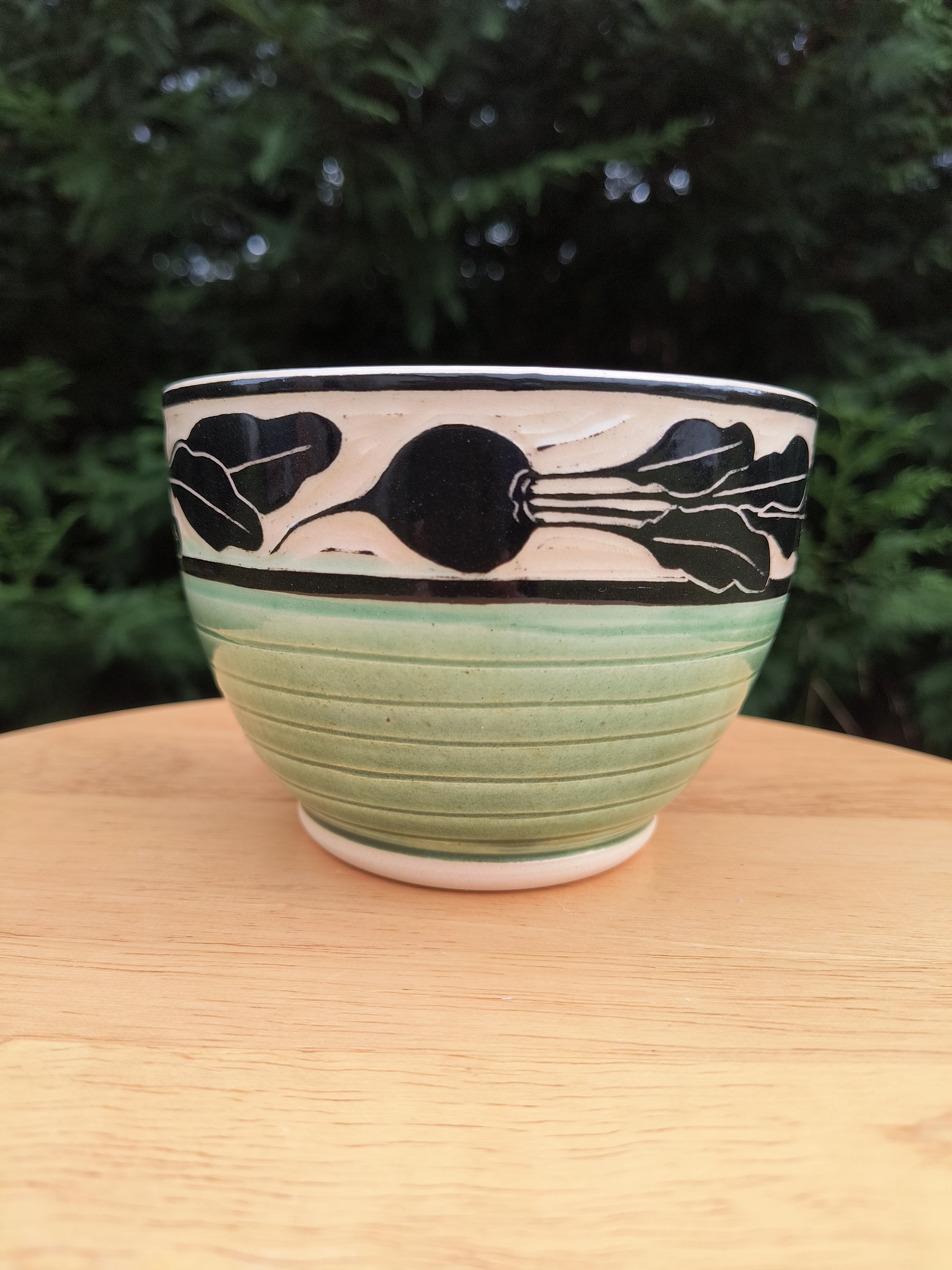 White clay bowl with black underglaze and sgraffito radishes around the rim. Green exterior and interior glaze. Has 2 French breakfast radish and 1 normal radish.