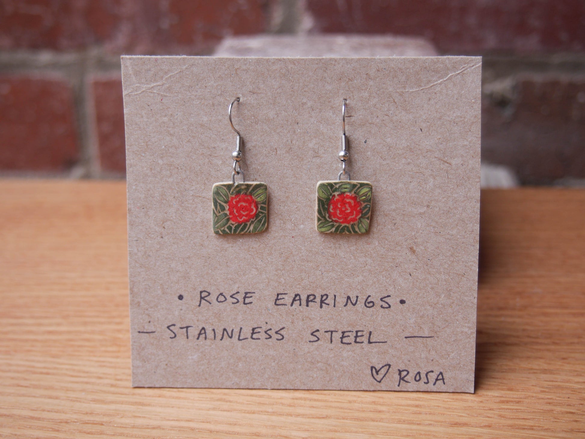 white clay, red and green underglaze, sgraffito, clear glaze, high fire wire, stainless steel. Cone 6 electric.